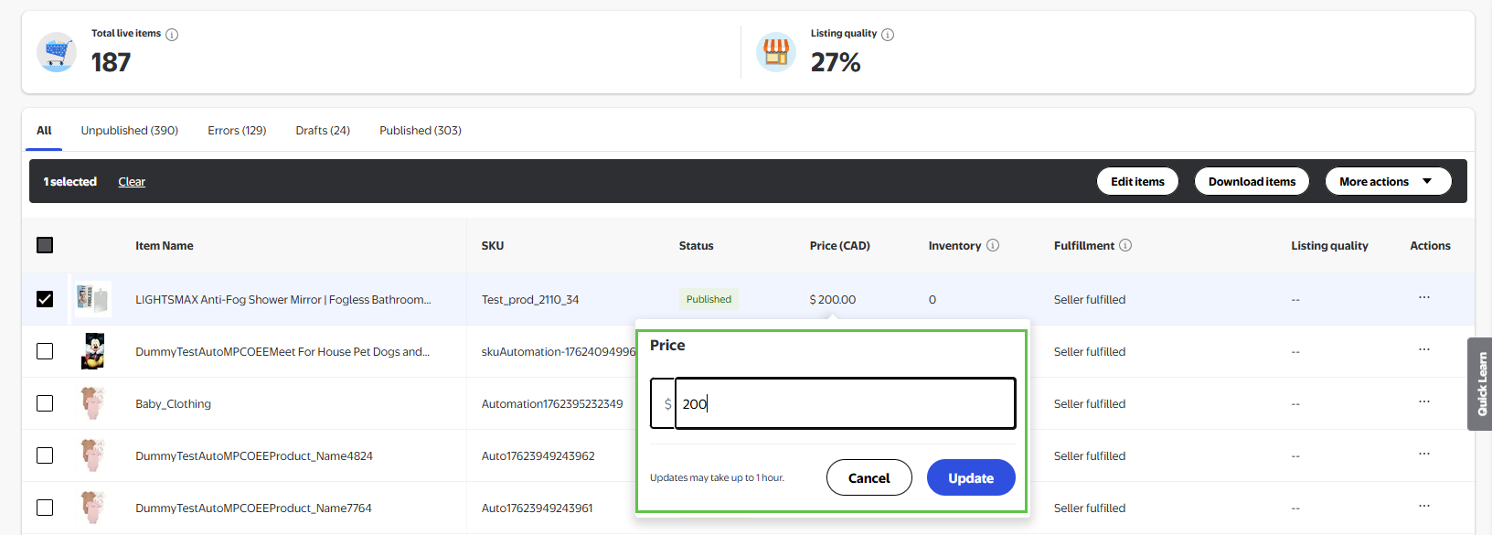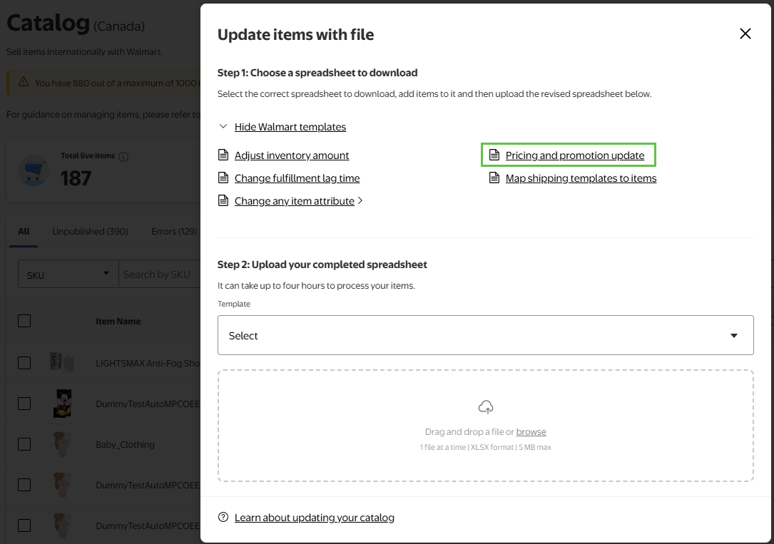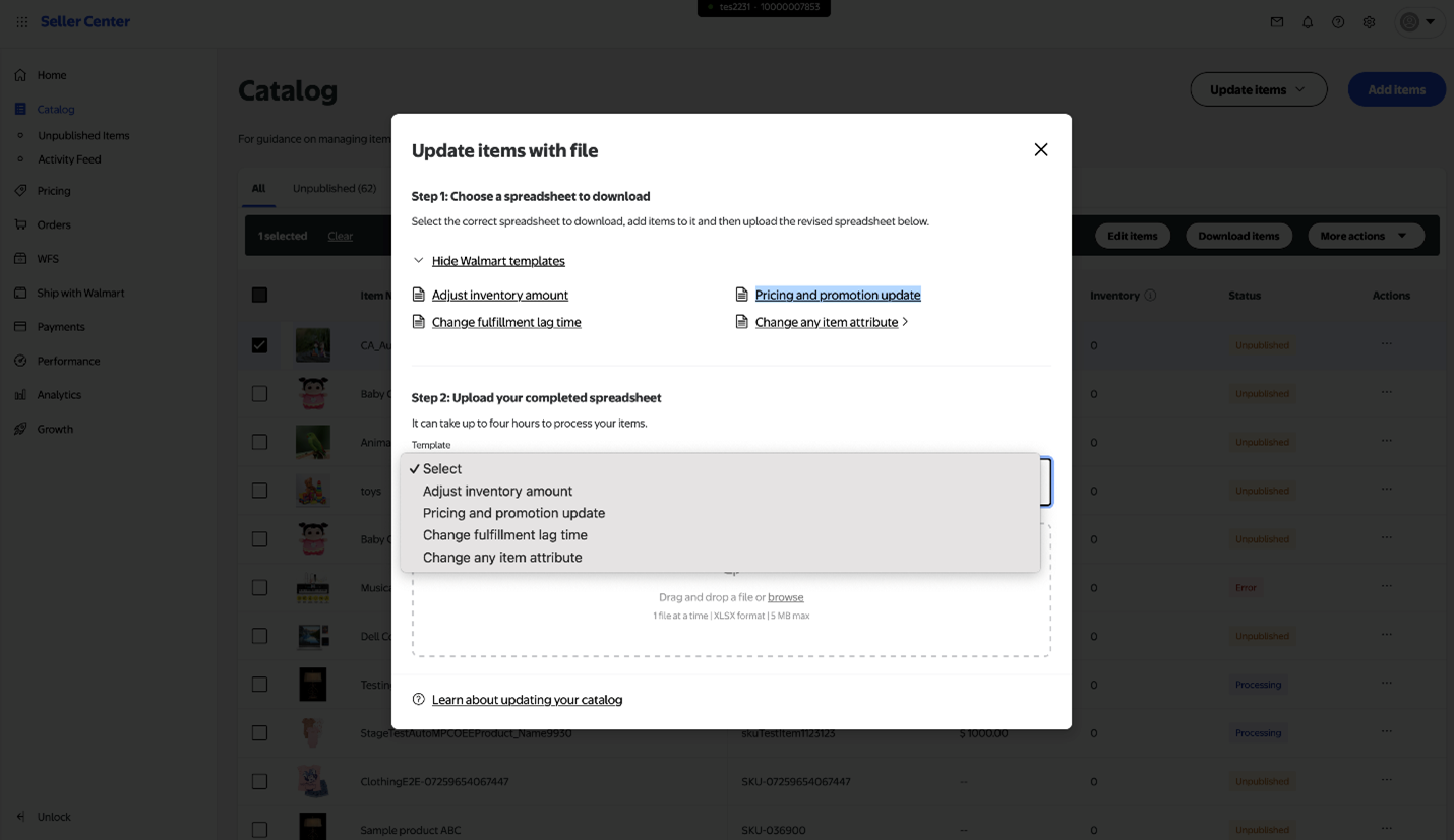 You can update your items from the Catalog page in Seller Center. This page includes a list of all of the SKUs you offer on Walmart.ca. To update inventory for individual SKUs: