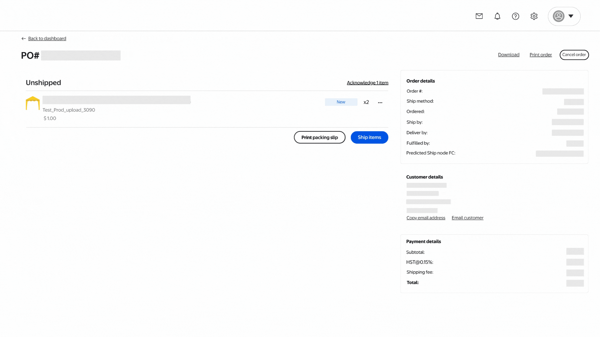 Download, Print, or Cancel Order | These options allow the seller to download the order details, print packing slips or cancel the order. |