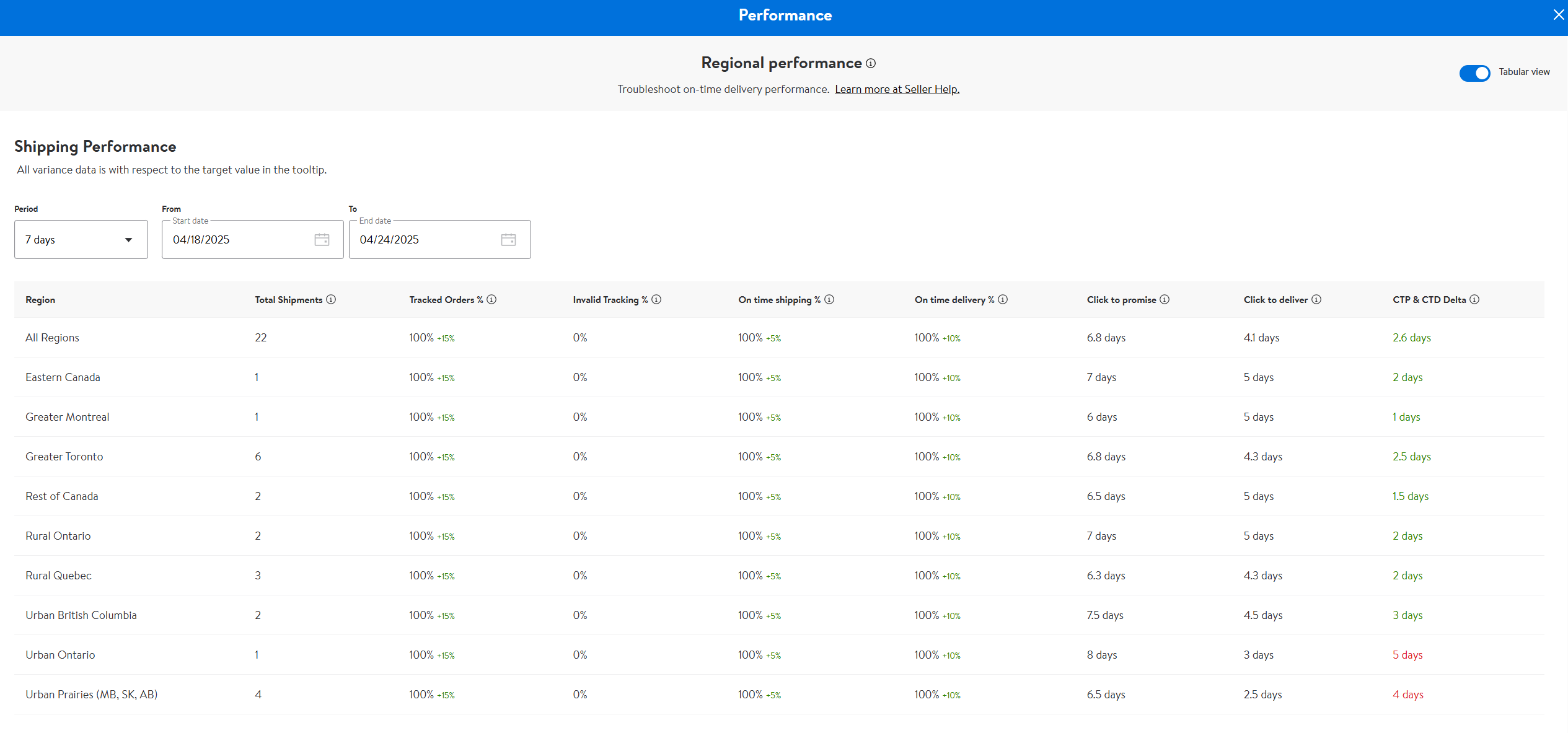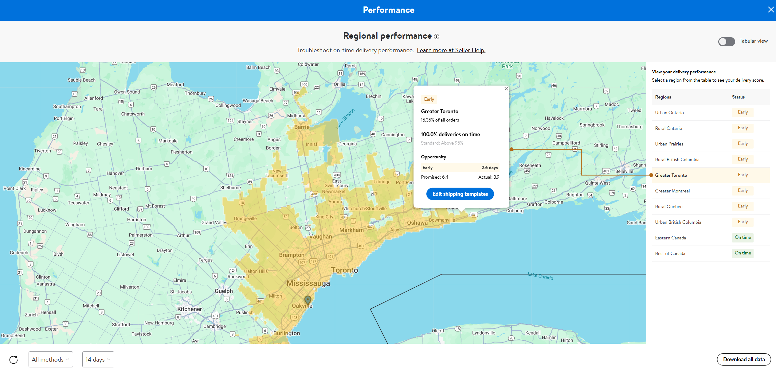 Using the Map view - select any Canada shipping region where you deliver to view the details of your delivery performance, including:Â