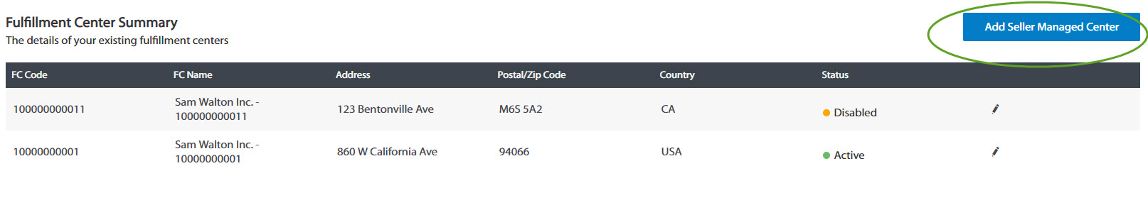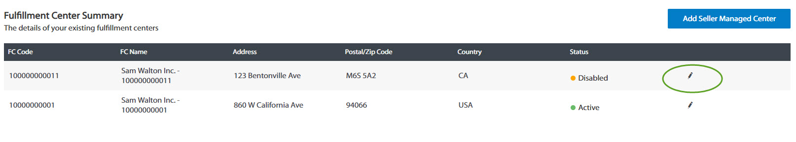 2. Edit the FC details as desired. If you no longer use this FC, click "Disabled" under Fulfillment Center Status.