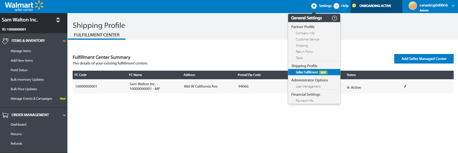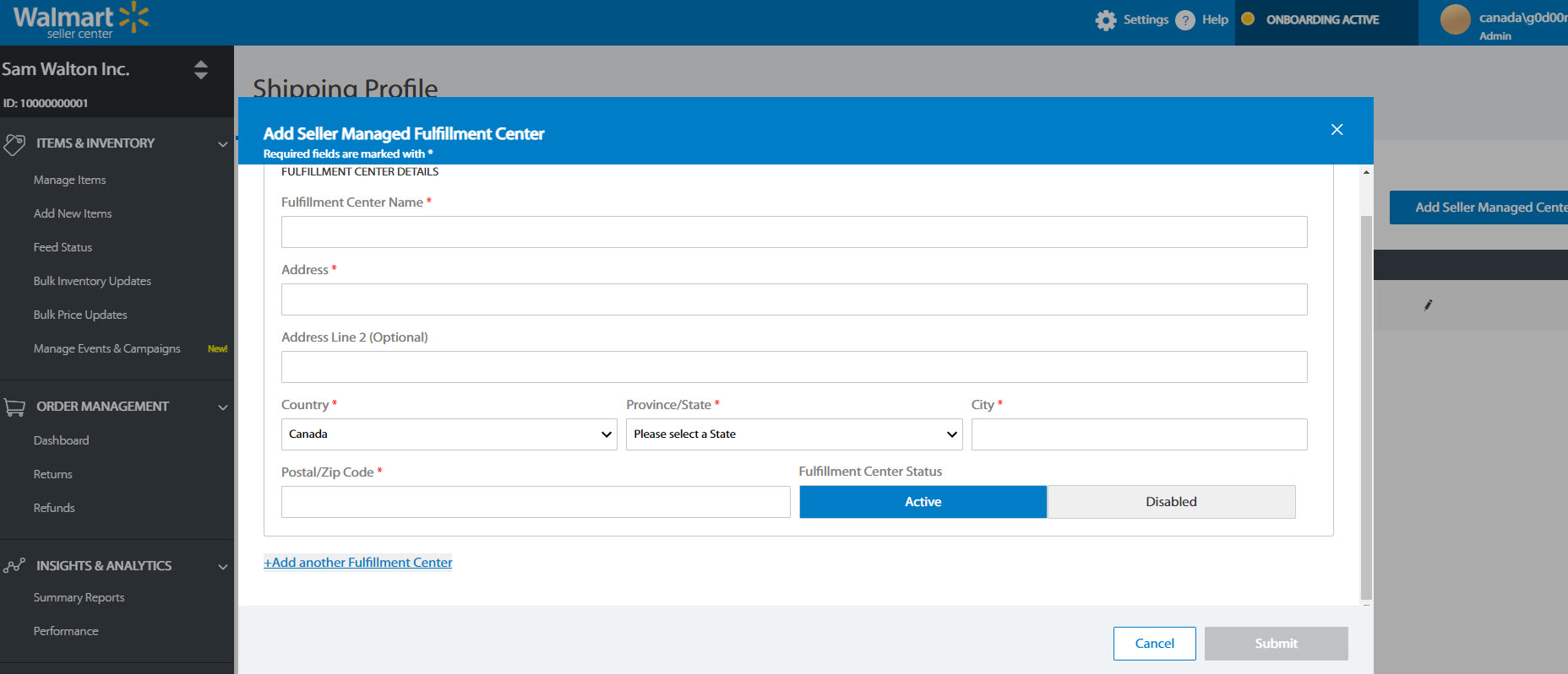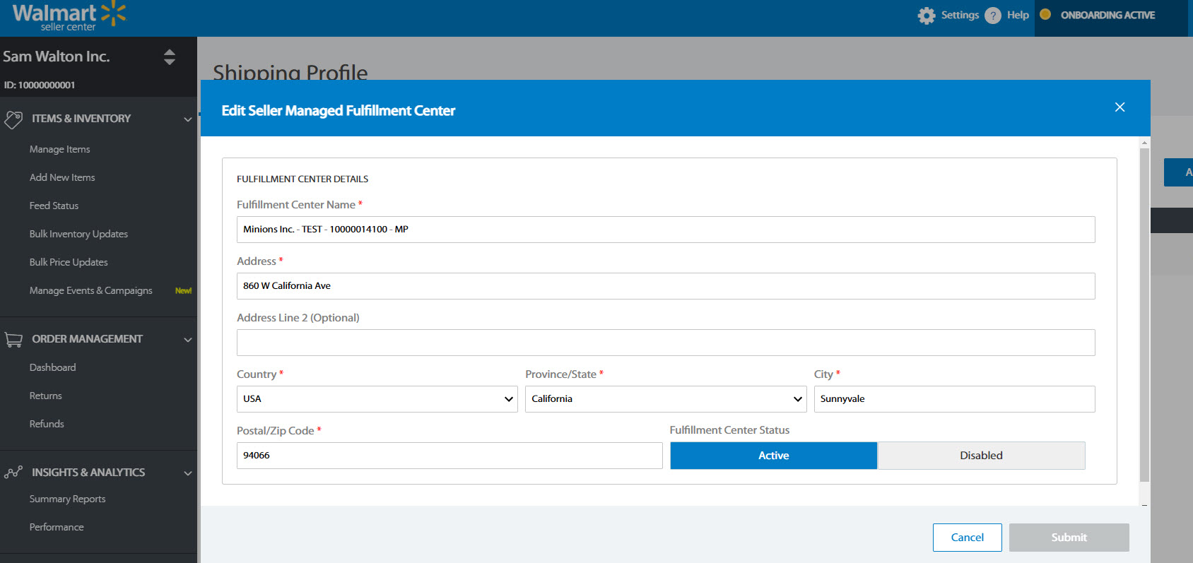 Sellers are required to provide information on their fulfillment centers so that Walmart has visibility to where items are shipping from. This information will help to ensure compliance with local tax laws, and will enable participation in future fulfillment programs and services.