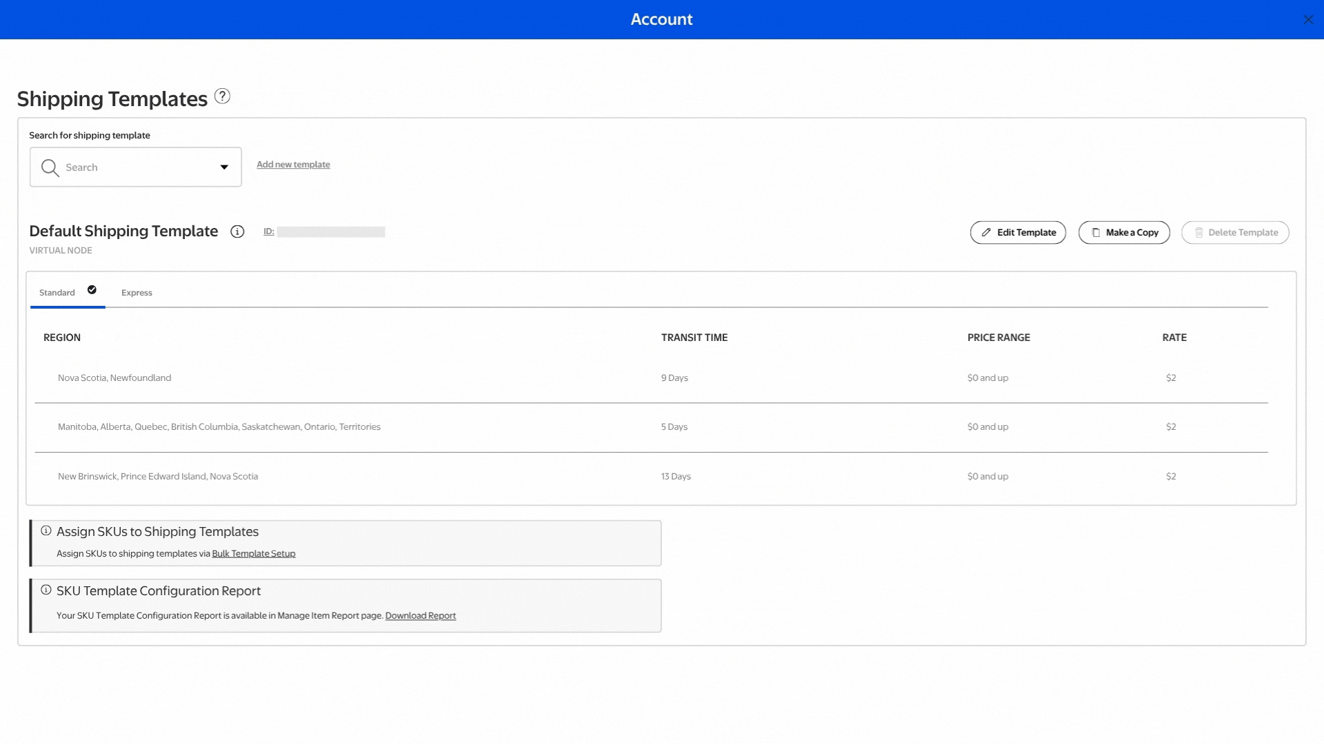 - Select Edit Template. When you select a shipment template, you will see the current configurations for Standard or Express listed with the shipping regions.