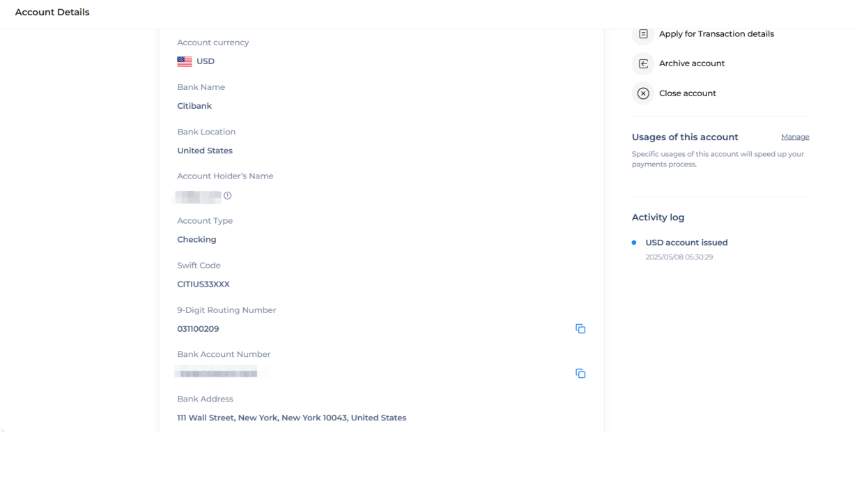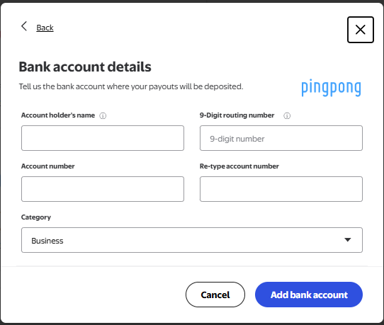4. Enter your bank account details. You can find your bank account number and routing number under the “Account Details” section in PingPong.