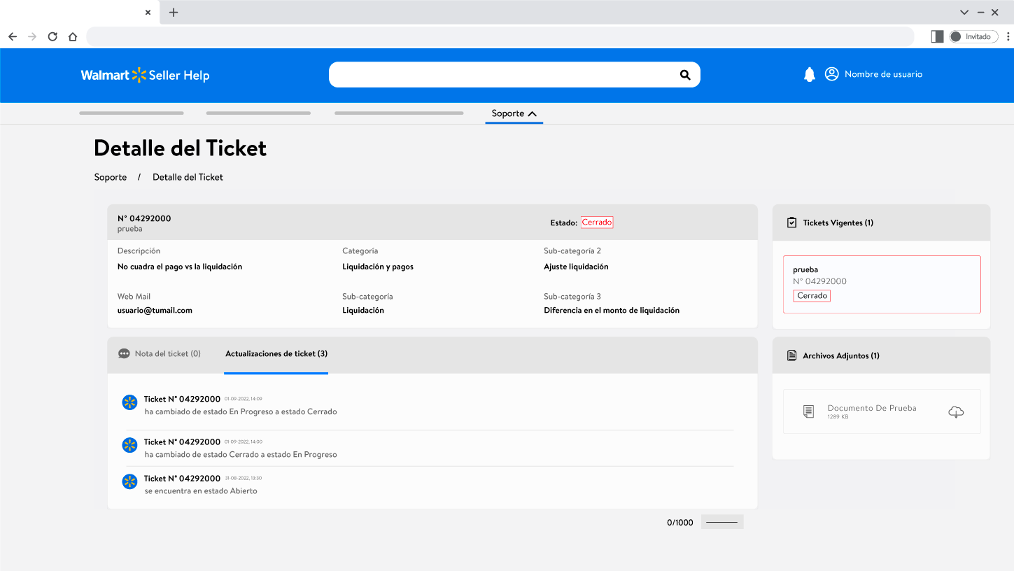 - You will be redirected to Detalle del Ticket (Ticket details). Check the assigned number to your case.
