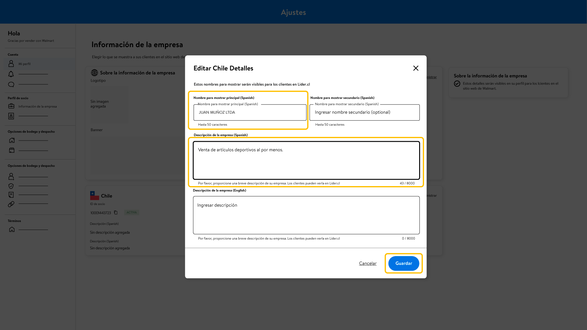 - Aparecerá una ventana emergente. Podrás editar los siguientes campos: Nombre para mostrar principal (Spanish). Este será el nombre que los clientes verán en el sitio líder.cl y Descripción de la empresa (Spanish).