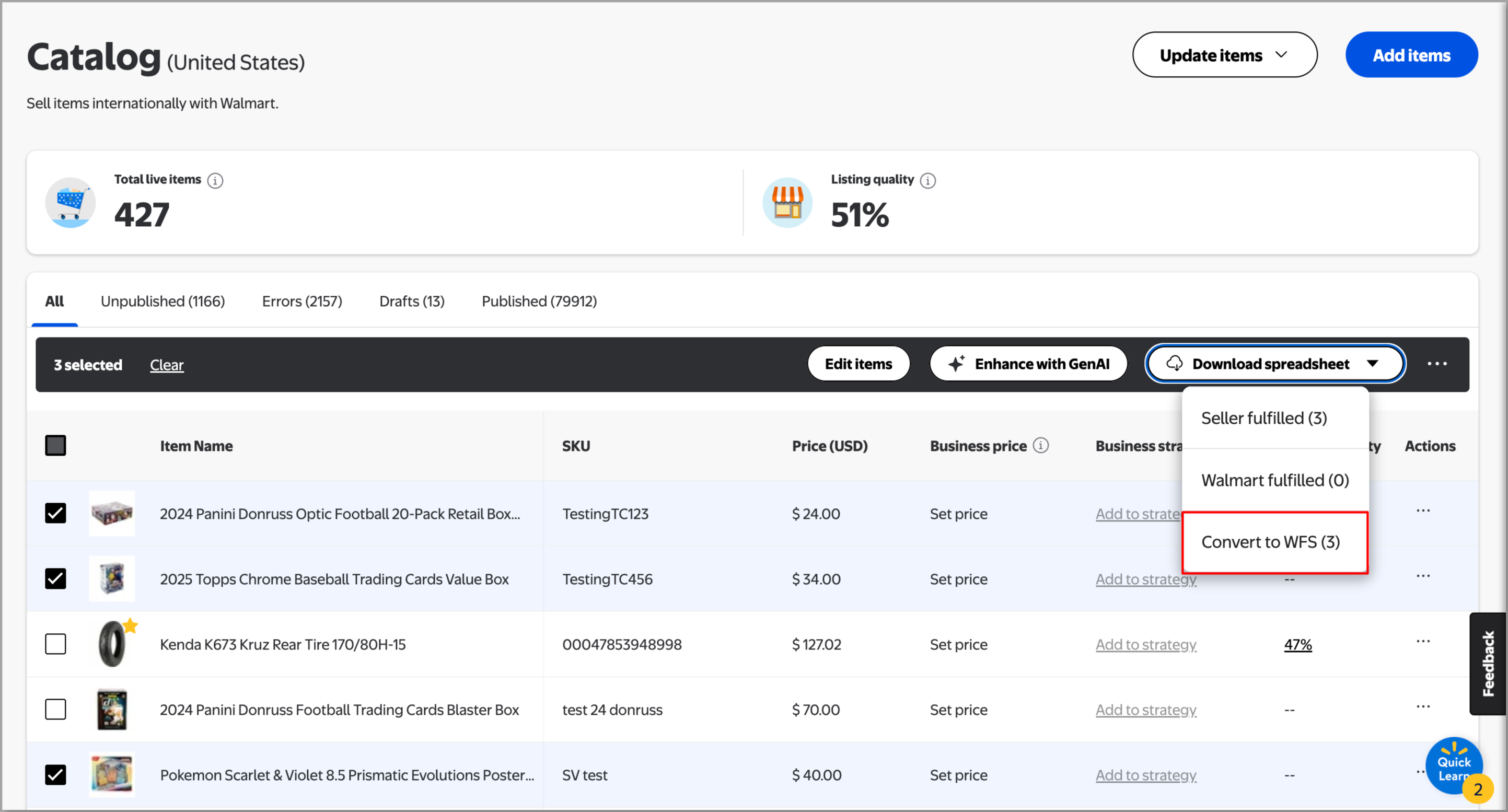 Navigate to Catalog and select all items you want to convert to Walmart-fulfilled. You can also filter by fulfillment type to find all seller-fulfilled items. In the actions bar, select Download spreadsheet and then Convert to WFS.