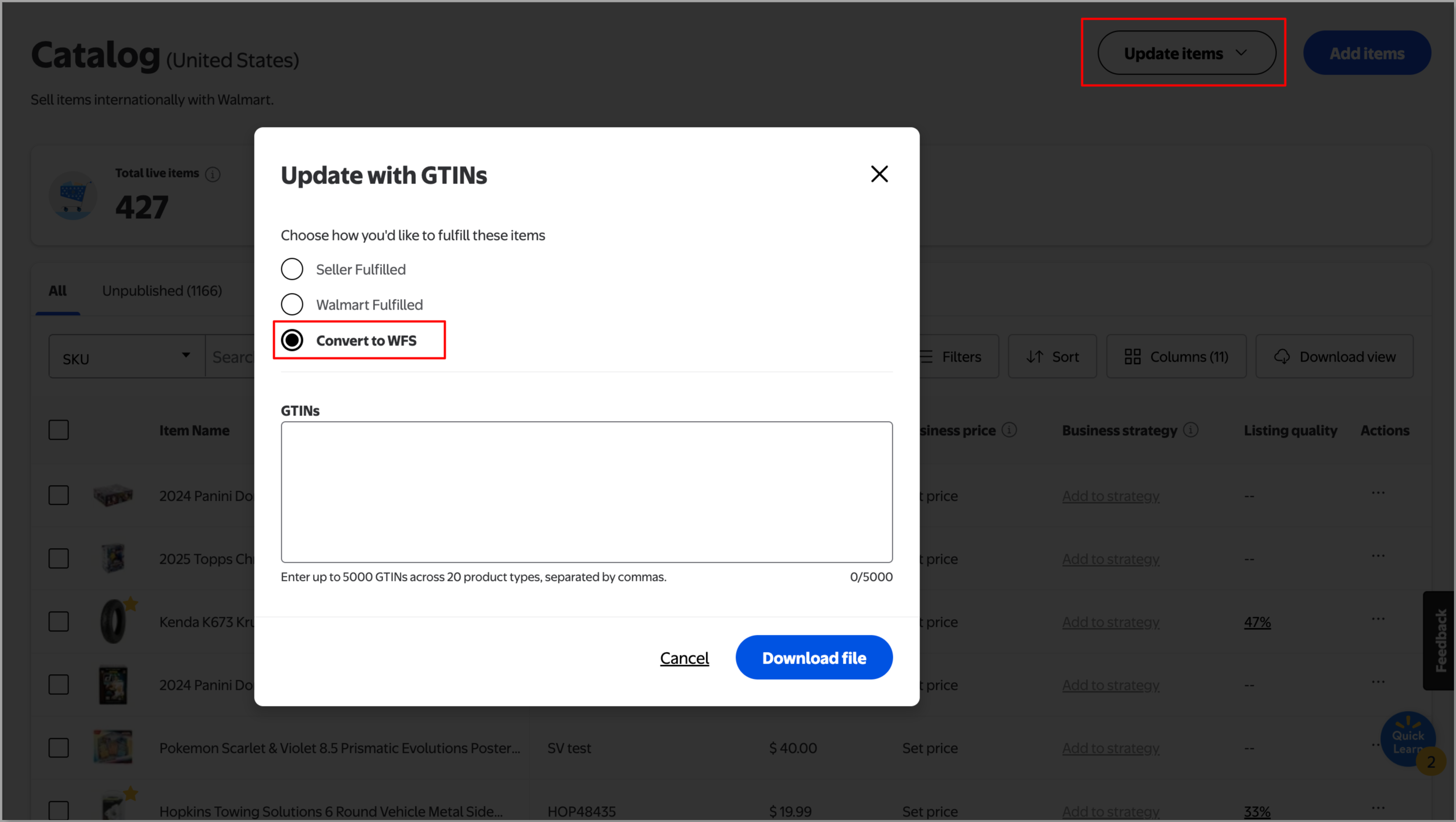 Navigate to Catalog and select Update items. Choose Update with GTINs. In the pop-up, select Convert to WFS. You can then enter up to 5,000 GTINs to convert. If you paste a list of GTINs, we’ll automatically separate each GTIN for you and check for errors. When you’re done, select Download file to create the template.