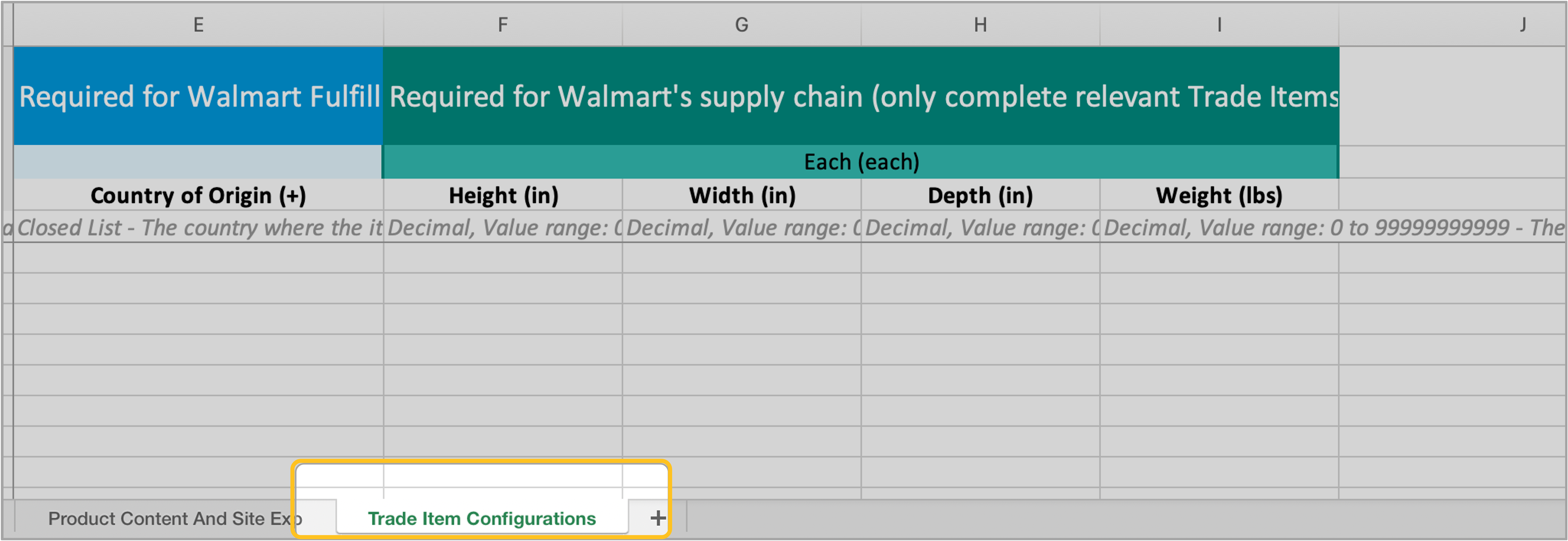 You must enter country of origin, weight and dimensions for each item. We use this information to comply with regulations, determine fees and plan for how your item will fit in our fulfillment centers. To learn how to measure items, go to WFS trade item configuration.Â