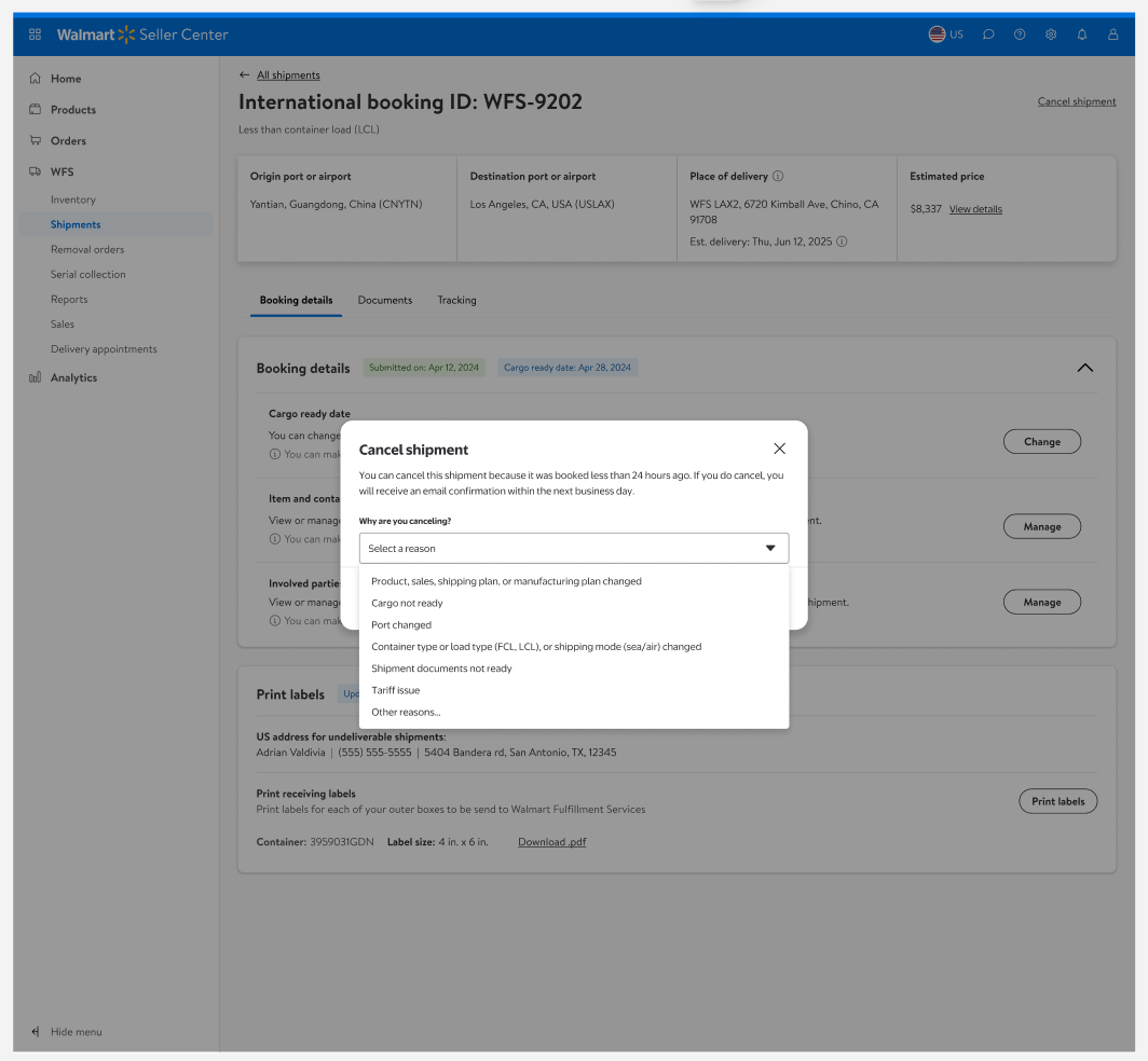 Walmart Cross Border: Imports - How to edit or cancel a booking