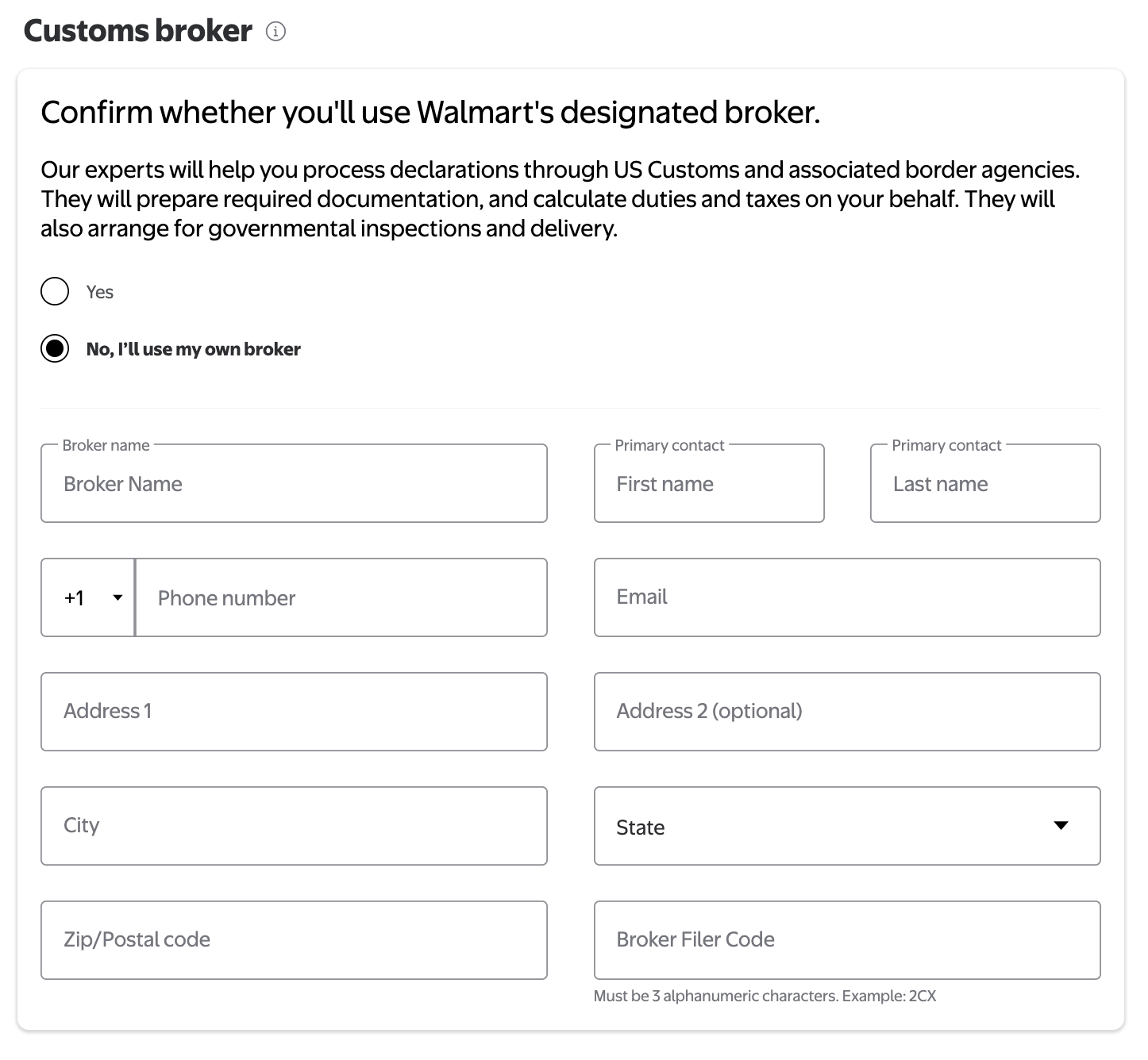 During this step, you can choose to use Walmart’s designated broker or add your own customs broker. Enter the required customs broker information in the corresponding fields.