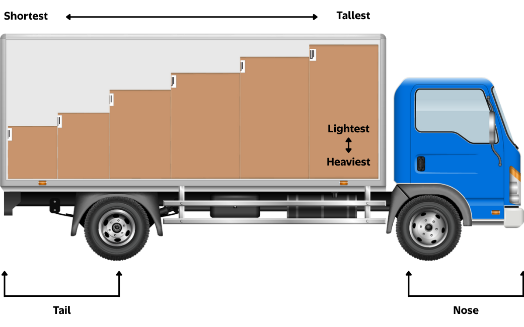 Tall cartons should be in the back (nose end), with smaller cartons stacked toward the door (tail end).