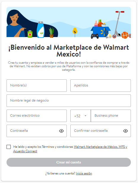 En esta guĂa te acopmañaremos a completar tu registro para comenzar a vender en Marketplace. Ingresa al siguiente link: Signup | Walmart Seller Center