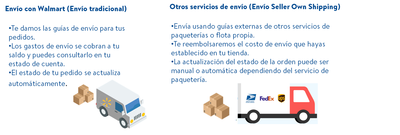 Puedes elegir entre EnvĂo con Walmart (Tradicional) u otros servicios de envĂo (Seller Own Shipping)